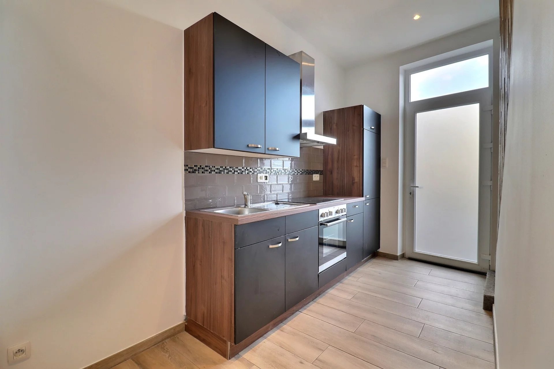 Rez-de-chaussée : un agréable salon, une cuisine équipée moderne avec accès direct à une cour extérieure.