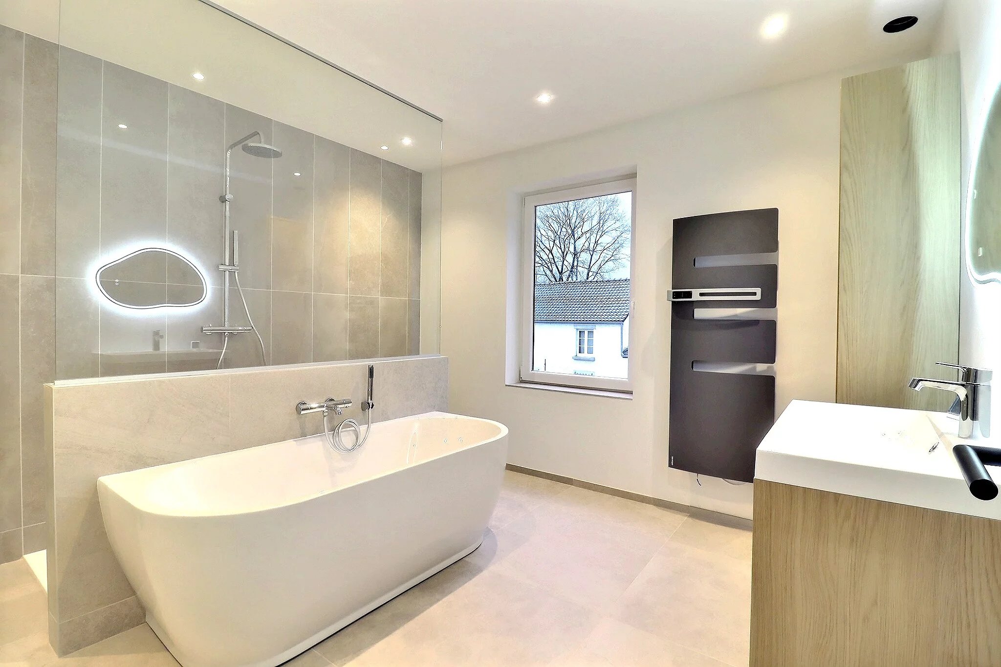 - une salle de bain complète équipée d’une baignoire, d’une douche à l’italienne et de toilettes.