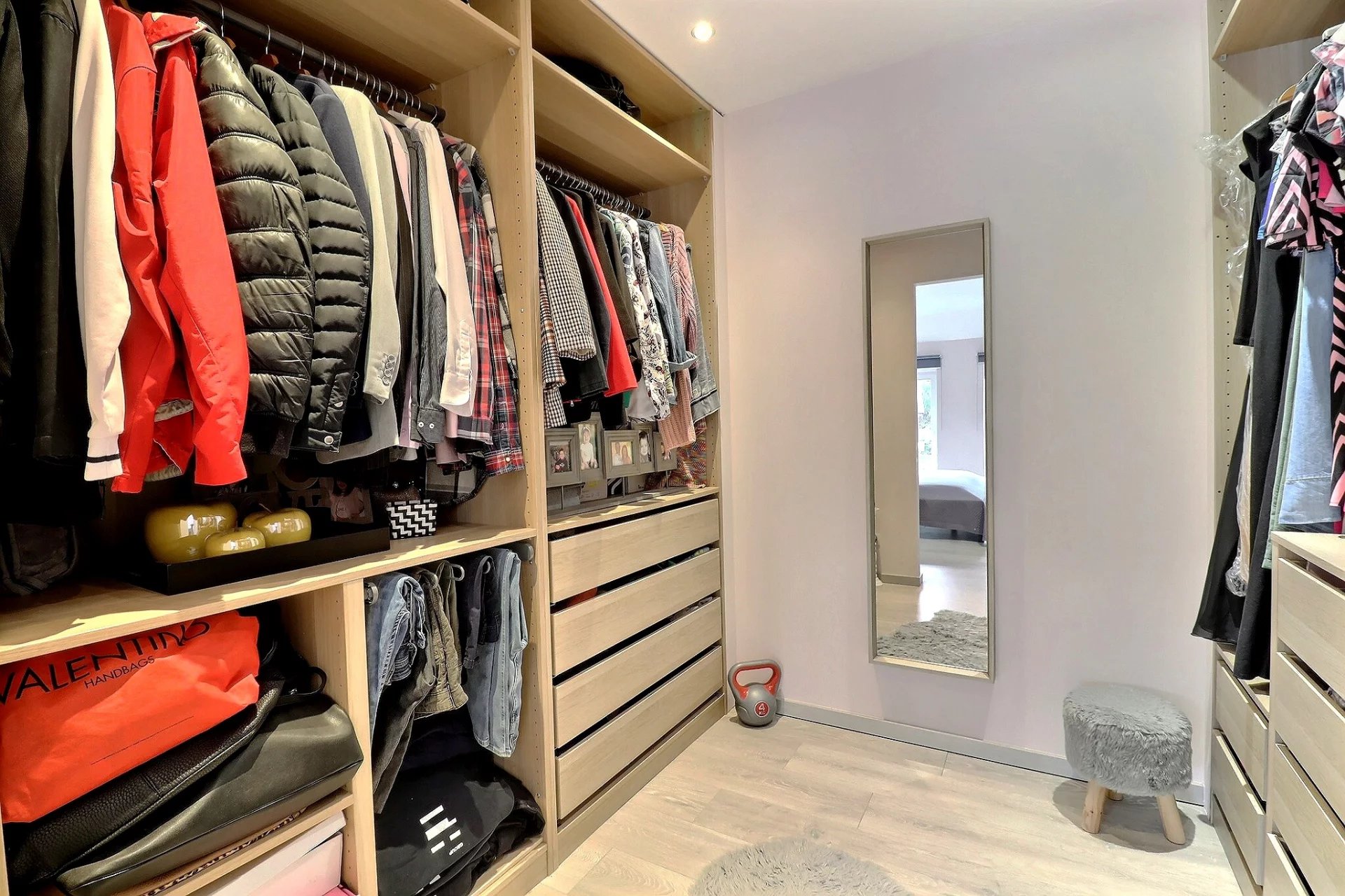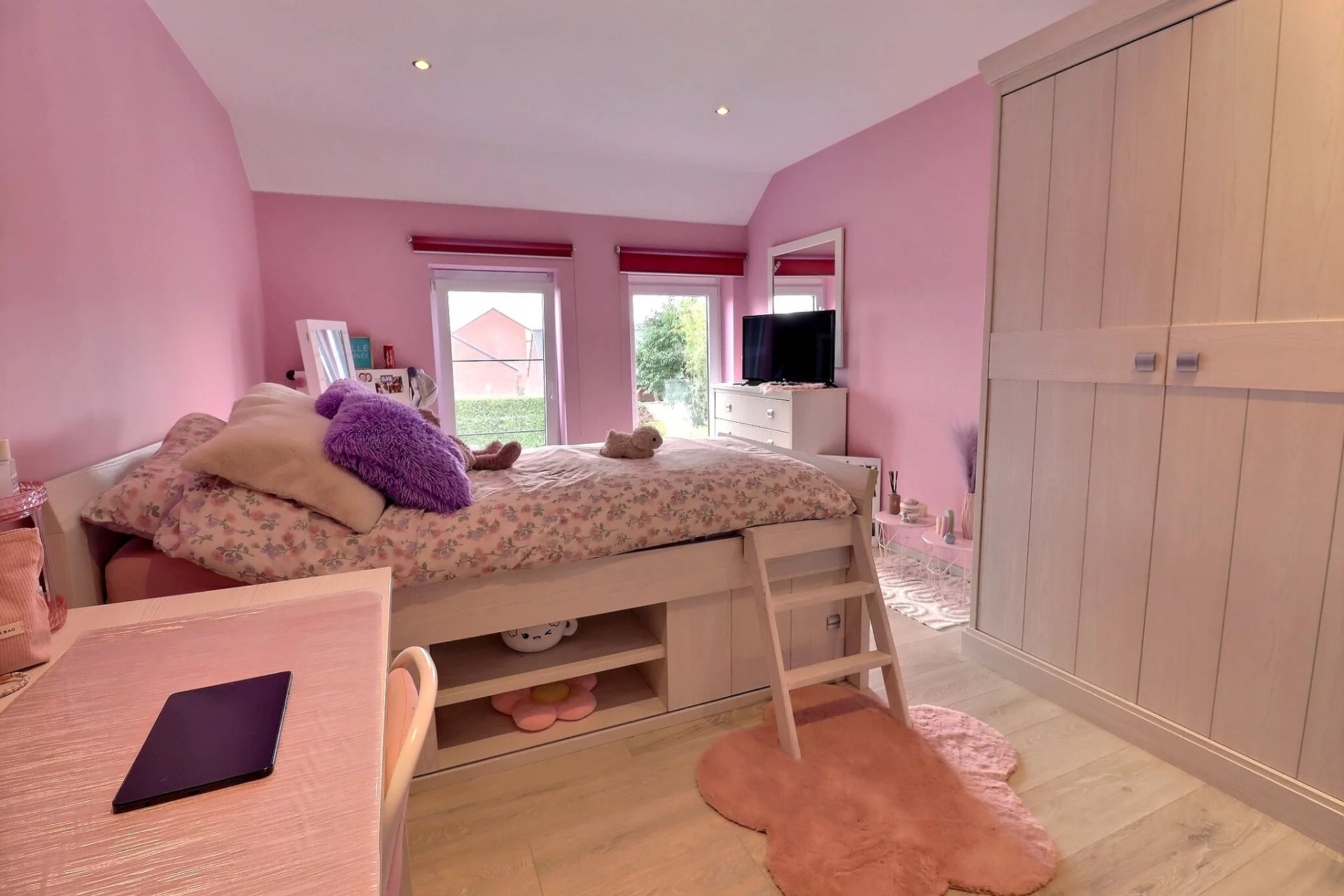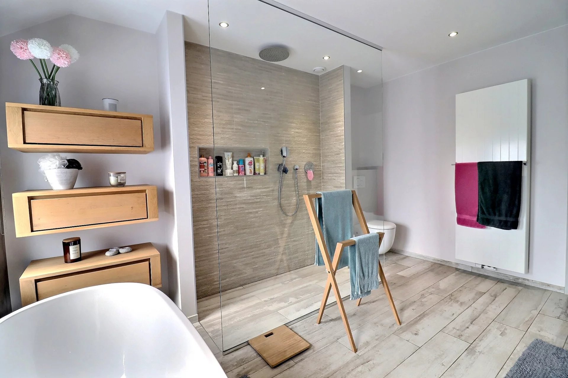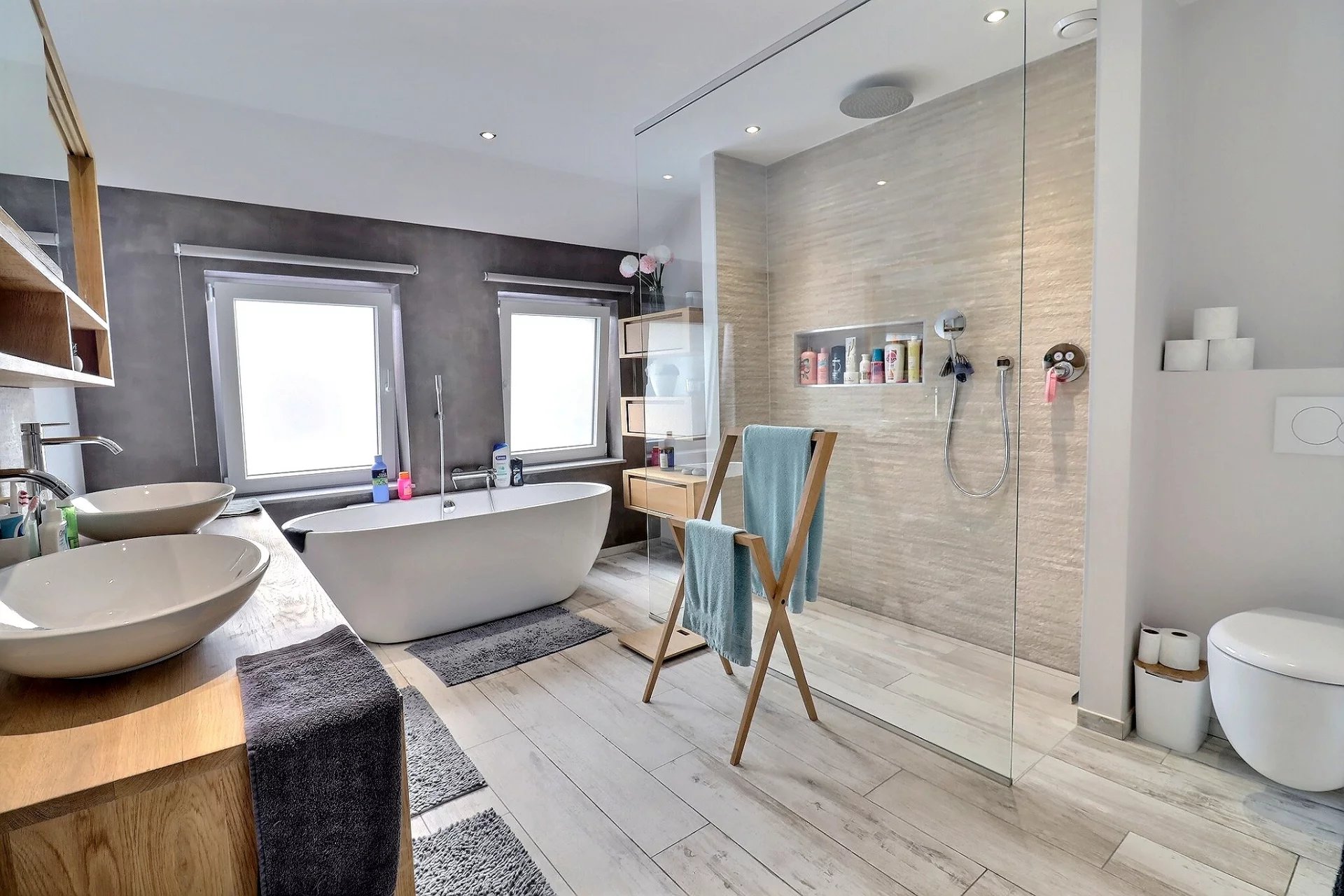 À l’étage, un hall de nuit mène vers trois chambres confortables, dont une suite parentale avec dressing, ainsi qu’une salle de bain moderne équipée d’une baignoire, d’une douche et d’un double lavabo, avec une toilette supplémentaire. Une buanderie vient compléter ce niveau.