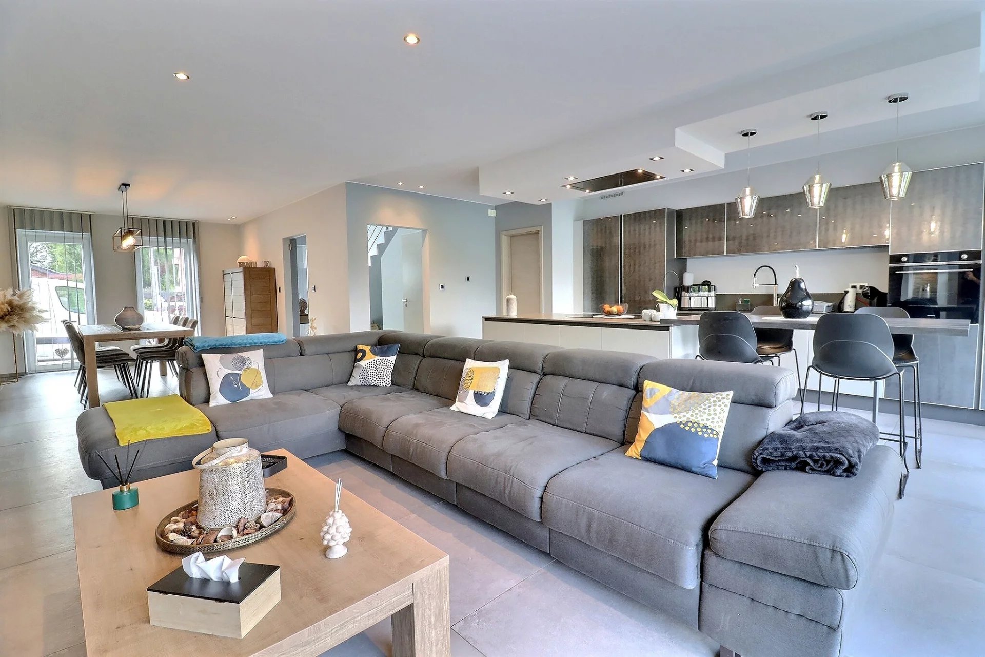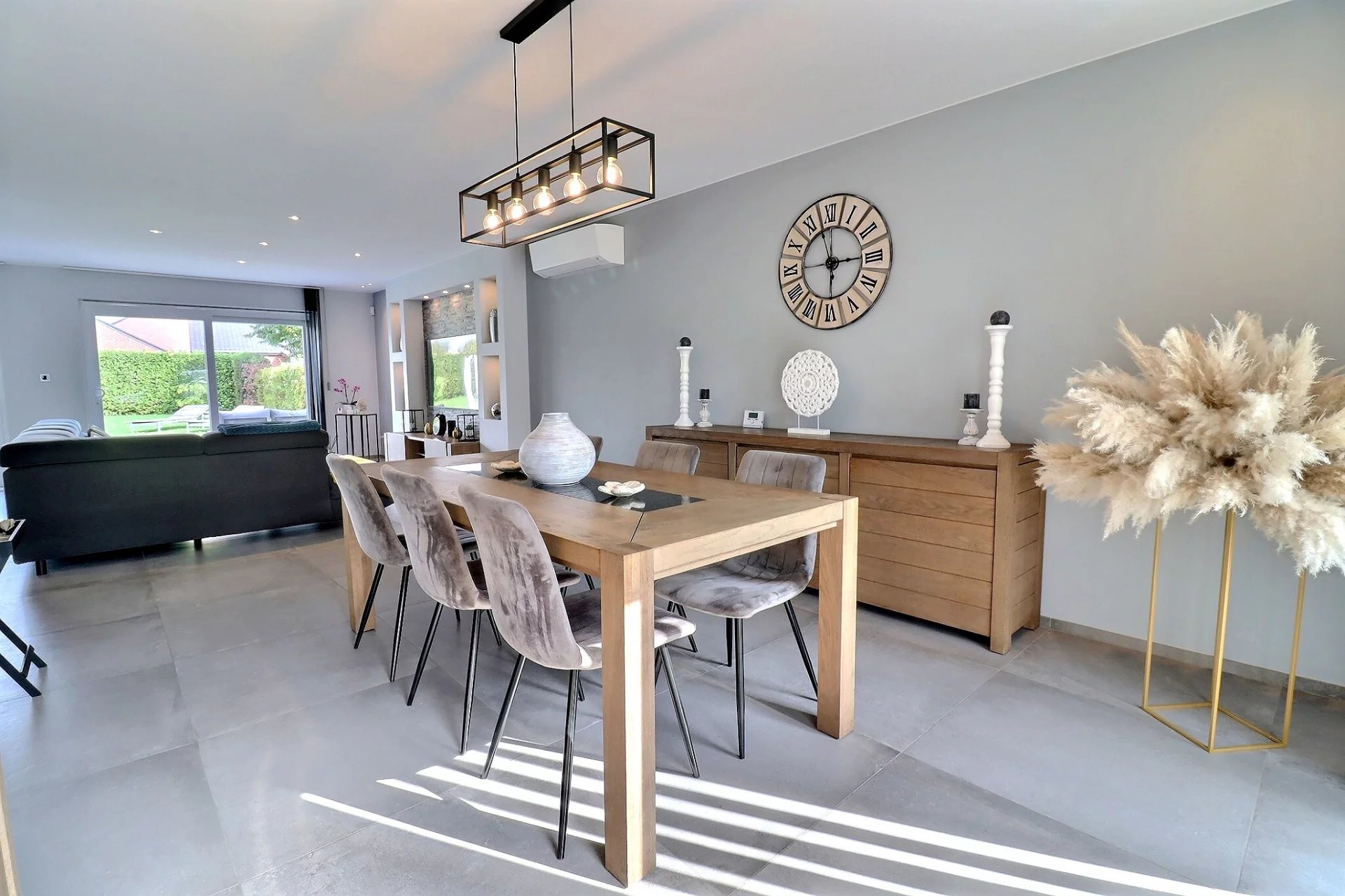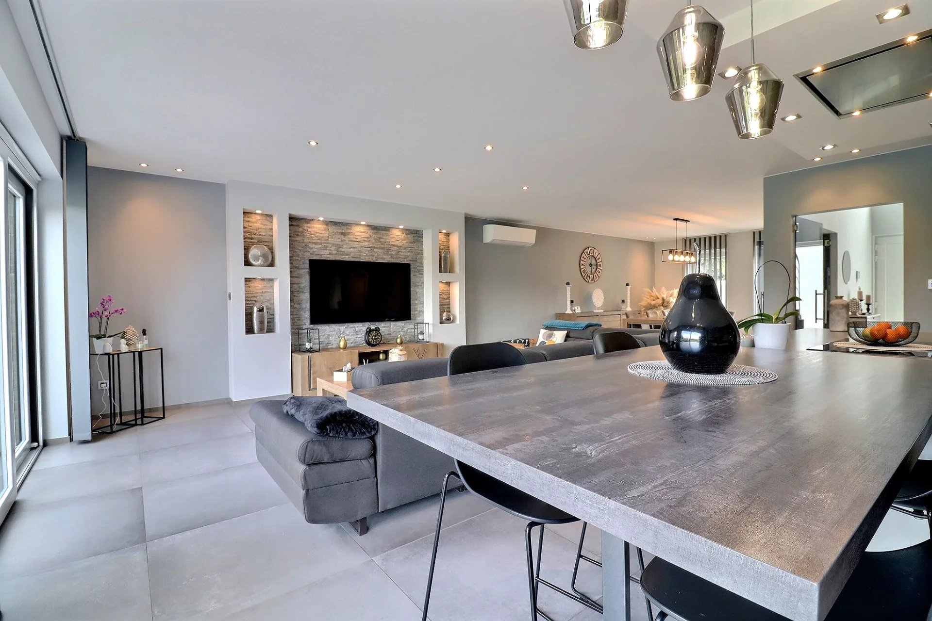Au rez-de-chaussée, un hall d’entrée spacieux dessert une salle à manger chaleureuse et un vaste séjour avec salon, salle à manger et cuisine ouverte (± 42 m²), offrant un espace lumineux et convivial. On y retrouve également un WC séparé ainsi qu’un garage attenant (± 17,5 m²).