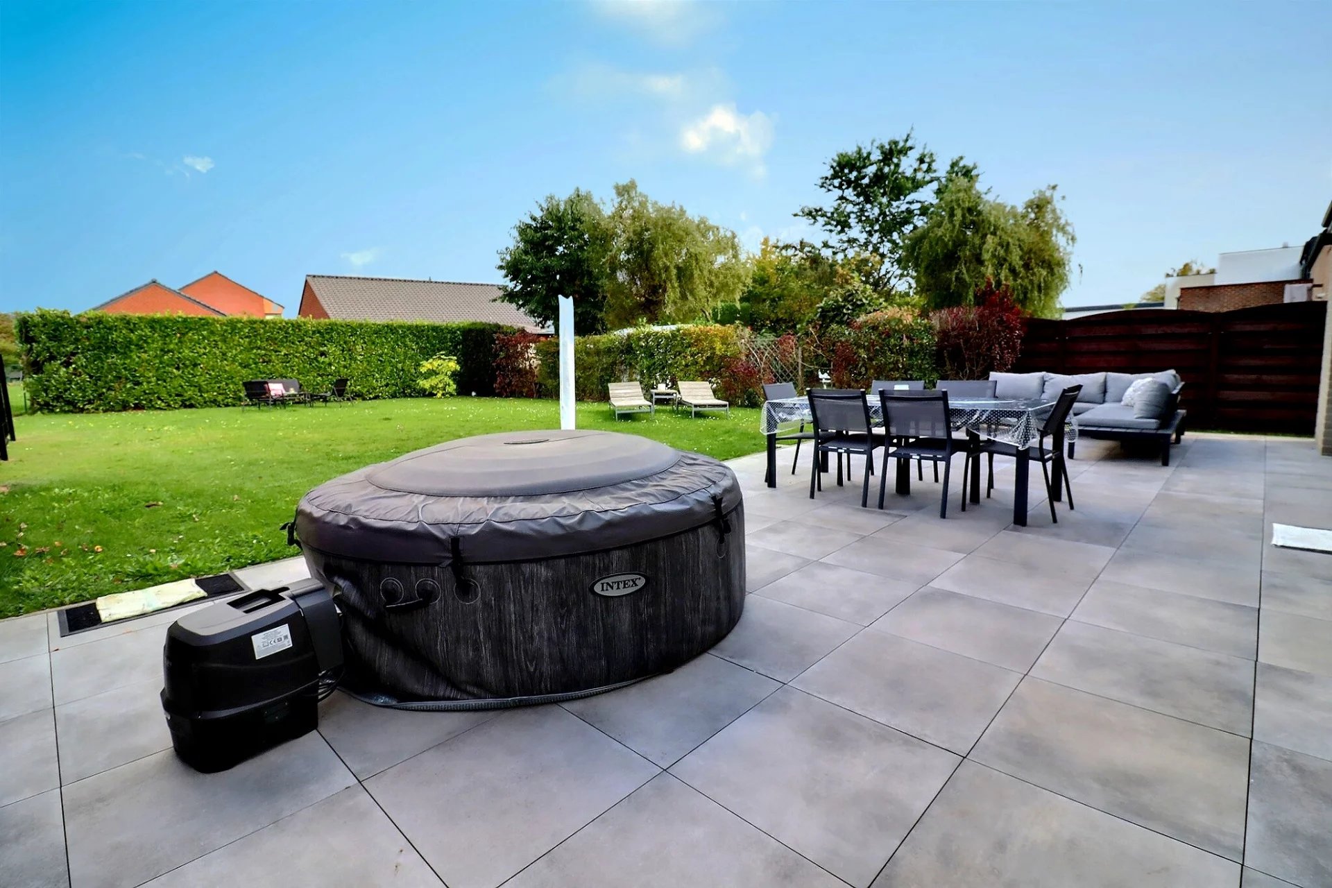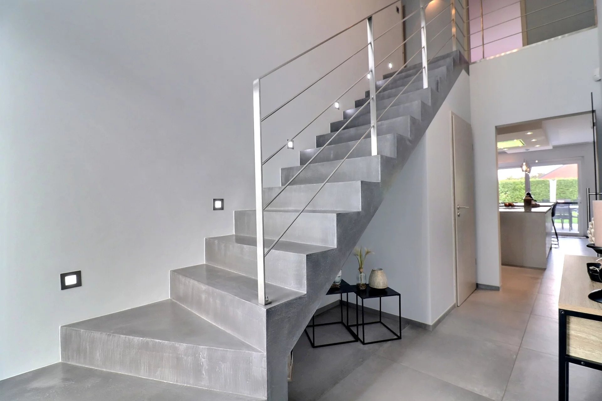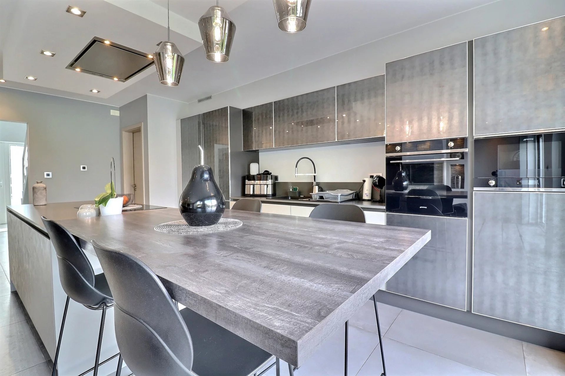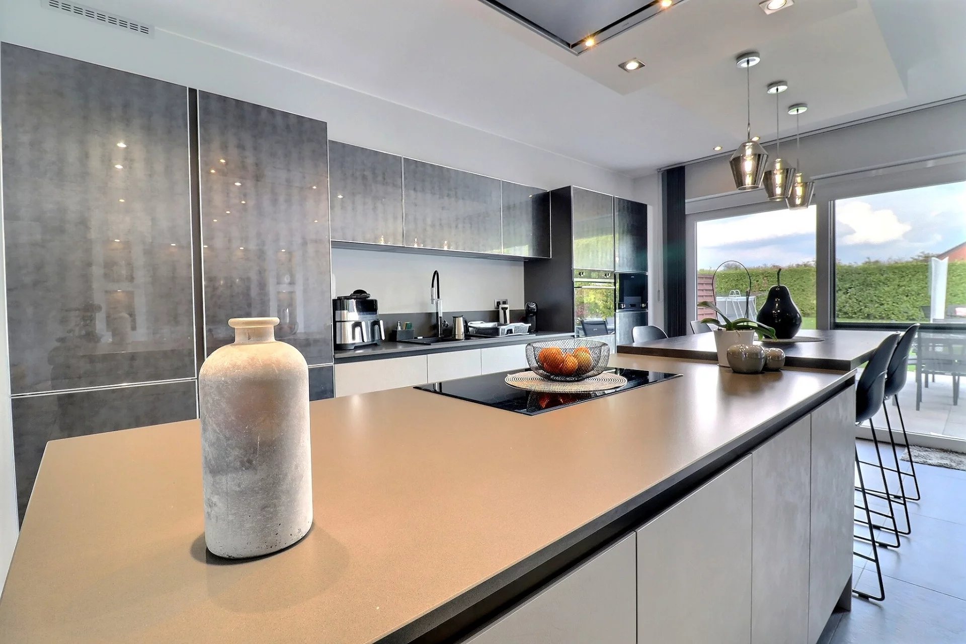 Au rez-de-chaussée, un hall d’entrée spacieux dessert une salle à manger chaleureuse et un vaste séjour avec salon, salle à manger et cuisine ouverte (± 42 m²), offrant un espace lumineux et convivial. On y retrouve également un WC séparé ainsi qu’un garage attenant (± 17,5 m²).